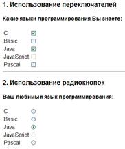 Элемент input со значением type="checkbox" или type="radio" задает переключатель или радиокнопку с двумя состояниями (включен/выключен). Компоненты, содержащие переключатели или радиокнопки можно объединить в группу, присвоив им одинаковые значения в атрибуте name. Различие между переключателями и радиокнопками заключается в том, что для группы переключателей можно задать включенными несколько компонент, а для радиокнопок – только один компонент (поэтому радиокнопки называют также альтернативными переключателями). По умолчанию переключатель и радиокнопка первоначально находятся в выключенном состоянии. Чтобы задать начальное состояние элемента как включенное, используется атрибут checked (без значения). Если для радиокнопок несколько элементов имеют атрибут checked, то включенным окажется последний элемент. Значение атрибута value для переключателей и радиокнопок должно задавать уникальное значение для каждого переключателя или радиокнопки (именно по значению этого атрибута выполняется анализ состояния данного компонента).