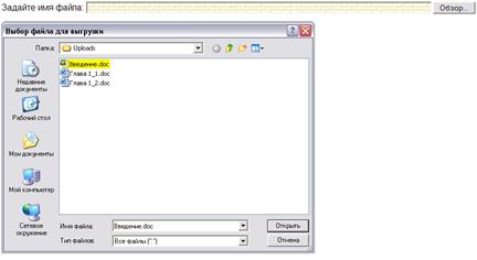 Элемент input со значением type="file" создает компонент, состоящий из текстового поле для ввода-вывода имени файла, сопровождаемое кнопкойОбзор (в Internet Explorer, Firefox и Opera) или Выбрать файл в Safari. Имя файла с указанием полного пути можно непосредственно ввести в текстовое поле или, воспользовавшись кнопкойОбзор (Choose File), выбрать его из окна Windows с именем Выбор файла для выгрузки (в Internet Explorer), Загрузка файла (в Firefox и Safari), Открыть (в Opera). Выделенное имя файла после нажатия кнопки Открыть окна выводится в текстовом поле, причем во всех Web-браузерах, кроме Safari, выводится полный путь к выбранному файлу (в Safari выводится только имя файла).