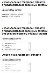 3. Задание в документе HTML текстовой области с первоначальным содержимым, текстовой области только для чтения и отключенной текстовой области: