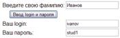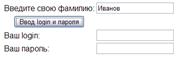 Тело документа HTML для ввода фамилии пользователя, вызова окна ввода login и пароля пользователя и вывода значений login и пароля имеет следующий вид: