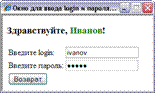 В первой Web-странице вводится фамилия пользователя, а затем нажимается кнопка Ввод login и пароля. После ввода значений login и пароля и нажатия кнопки Возврат во второй Web-странице в первой Web-странице в текстовых полях выводятся значения login и пароля пользователя: