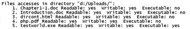 Следующий фрагмент программы выводит для файлов в каталоге "d:/Uploads/" возможность чтения, записи и выполнения: