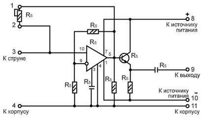 Резистор R5, подключённый к точкам 1 и 2 и размещенный в корпусе УИП-8, регулирует глубину положительной обратной связи,определяющей амплитуду колебаний струны и форму сигнала на выходе.