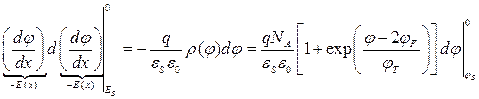 , имеющую смысл электрического поля, проинтегрируем обе стороны уравнения от границы раздела кремния с изолятором, где электрическое поле равно искомому полю
