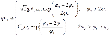 Полученная формула справедлива от глубокого обеднения до сильной инверсии. Плотность заряда электронов в канале в предельных случаях сильной инверсии и глубокого обеднения записывается в виде