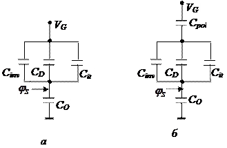 Эта формула означает, что емкости инверсионного, обедненного слоя и поверхностных состояний соединены параллельно, и все они вместе последовательно соединены с емкостью окисла (рис. 2.6).