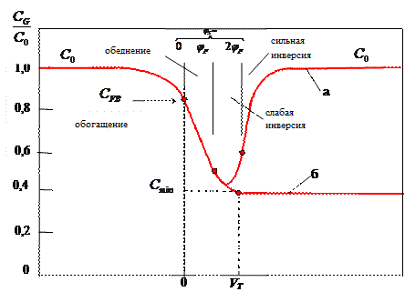 ВФХ МОП структуры в транзисторе всегда имеет вид низкочастотной характеристики, поскольку электроны поступают в канал из n +- областей стока и истока, и образование инверсионного слоя происходит практически мгновенно (за время ~10-11 с). В режиме обеднения емкость инверсионного слоя оказывается слишком малой по сравнению с емкостью обедненного слоя и поверхностных состояний, и поэтому, как и в инверсии,