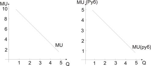 Представим данные по предельной полезности (MU) в единицах полезности и в рублях и рассмотрим, каким образом полезность связывается со спросом, а спрос влияет на цену.