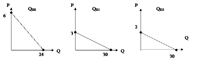 Из уравнений и графиков видно, что первый потребитель отказывается от покупок товаров при цене равной 6 ден. единиц, второй – при цене 3 ден. единиц, третий – при 2 ден. единицах. Соответственно величины отложенные на оси объема спроса показывают предельное количество продукции, которое они хотели бы иметь (24, 30, 30).