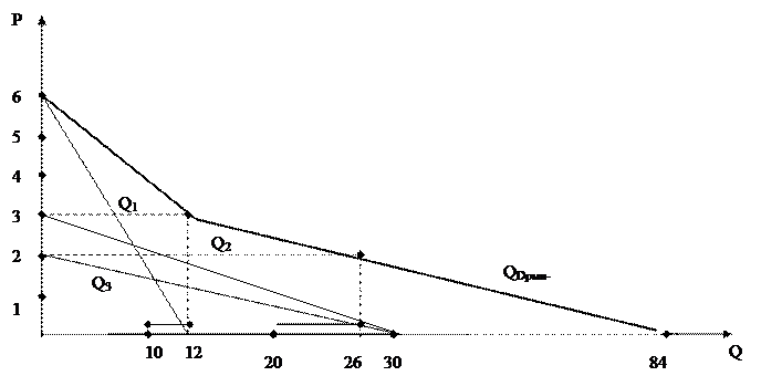 Суммируя значение индивидуального спроса мы получим объем рыночного спроса при различных уровнях цены. Изобразим это таблично, аналитически и графически. Из простого вида (линейного) кривых индивидуального спроса определим сначала индивидуальный спрос для пороговых значений цены, а затем определим рыночный спрос как сумму индивидуальных спросов и представим все в виде таблицы.