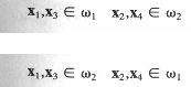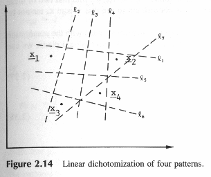 Общее число линейных дихотомий N точек в n-мерном евклидовом пространстве равно удвоенному числу путей, которыми эти точки могут быть разделены (n-1)-мерными гиперплоскостями. Так, D (4,2) = 2*7 = 14. Сравнивая с общим числом возможных дихотомий 2N = 16, мы находим, что две дихотомии линейно нереализуемы. На рис. видно, что точки (x1, x4) и (x2, x3) не могут быть линейно разделены. Можно показать, что общее число линейных дихотомий определяется следующим соотношением.
