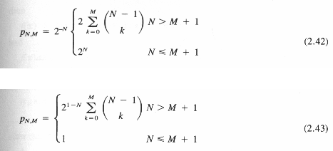 Отметим, что PN,M=1 для N<=M+1, что означает, что число образов меньше числа возможных весов для обобщенной решающей функции и, соответственно, образы могут быть всегда линейно разделены в М-мерном пространстве образов. Проведенный выше анализ не говорит нам как выбрать d(x) или φ(х), однако он оценивает возможность данной машины осуществлять дихотомию образов. Например, если у нас для двух классов имеется N образов, мы можем быть уверены, что если взять большое М, то всегда найдется подходящий.
