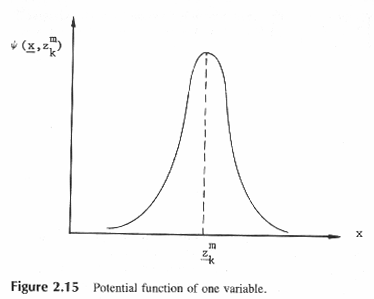 ) известна как ядро в оценке плотности вероятности, или есть функция Х и Zkm, определенная в пространстве образов, где Zkm – m-ый прототип, определяющий класс wk. Потенциальная функция хорошо иллюстрируется на рис. 2.15 для одномерного пространства образов. Этот потенциал определяет уменьшающееся соотношение между точкой Zkm и точкой х по мере того, как расстояние d(x, Zkm) между двумя точками увеличивается.
