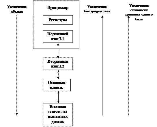 Иерархическая структура памяти позволяет экономически эффективно сочетать хранение больших объемов информации с быстрым доступом к информации в процессе ее обработки.
