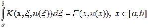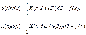 где ядро K (x, x, u) и правая часть F (x, u) считаются заданными функциями. Среди нелинейных интегральных уравнений общего вида (1) различают нелинейные уравнения Урысона и Гоммерштейна: