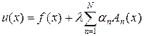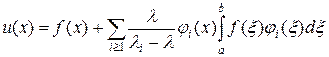 Неоднородное уравнение Фредгольма (3) при значении параметра l, отличного от любого из собственных значений li ядра, имеет единственное решение u (x), которое для симметричного ядра может быть представлено в виде разложения Шмидта: