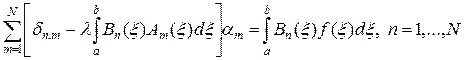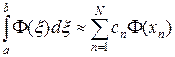 Рассмотрим далее линейные задачи. Для линейных задач обоснование сходимости содержится в теории Фредгольма, которая здесь не приводится из-за своей громоздкости[2]. Пусть для аппроксимации интеграла, взятого на отрезке [ a, b ], используется одна из линейных квадратурных формул с узлами xn, и весами cn, n = 1,…, N, т.е.