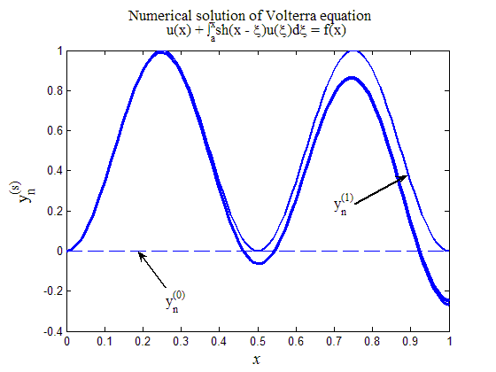 На рис.5 приведен итог работы кода программы листинга_№5. Было осуществлено численное решение уравнения Вольтерра (17) методом последовательных приближений согласно расчетной формуле (26). Расчеты показали, что достаточно 6 итераций для достижения точности сходимости e = 10-6. На рис.5 пунктирной линией обозначена нулевая итерация u 0(x) = 0. Последующие итерации представлены линиями с все большей толщиной и, начиная с третьей итерации, в имеющемся масштабе линии уже не различаются. Таким образом, метод последовательных итераций является весьма эффективным для решения уравнений Вольтерра второго рода.