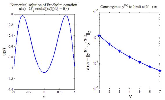 На рис.6 приведен итог работы кода программы листинга_№6. На левом рисунке приведено численное решение интегрального уравнения Фредгольма (30) методом замены ядра на вырожденное ядро (32), полученное путем разложения исходного ядра в ряд Фурье с последующим отбрасыванием бесконечного хвоста разложения. Расчетов проводилось несколько с различным числом оставленных слагаемых N в разложении (32). Численное решение y ( N ) уравнения (33), полученное при некотором N сравнивалось с предыдущим, т.е. с y ( N -1) на предмет сходимости к некоторому пределу при N ® ¥. На правом рисунке приведена зависимость ошибки error =