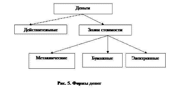 Деньги в своем развитии выступали в двух формах: действительные деньги и знаки стоимости (заменители действительных денег) (рис.5).