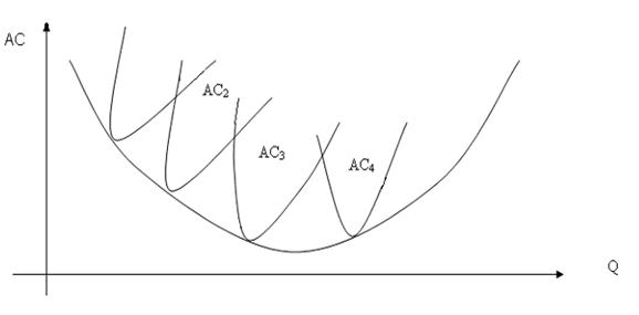 Кривая средних издержек длительного периода, так называемая оберточная кривая, образуется как касательная к множеству краткосрочных кривых средних издержек. Так как эти кривые в соответствии с законом убывающей отдачи поднимаются, то любое увеличение объема производства рано или поздно начнет приносить убытки. Но поскольку эти кривые и издержки, их образующие, связаны с конкретным оборудованием, которое через определенные промежутки времени заменяется на более современное, то издержки для каждой новой технологии будут свои: AVC1, AVC2, AVC3 и т. д. Результирующая долгосрочная кривая, проведенная по касательной к множеству краткосрочных кривых и как бы оборачивающая их, будет показывать, как изменяются издержки предприятия в долгосрочный период при разных технологических процессах (рис. 4).