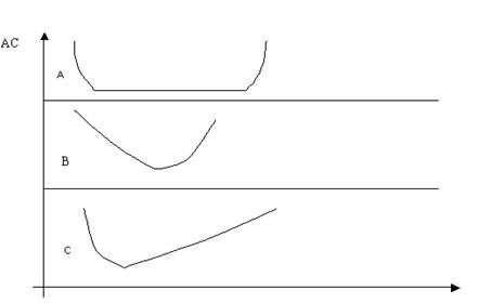 Можно проследить по крайней мере три модели предприятий с разными кривыми долгосрочных средних издержек (рис. 5).