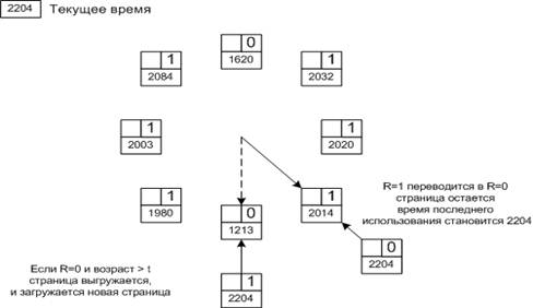 Если R=0 и возраст страницы > t, то страница выгружается и загружается новая страница; если R=1, то R переводится в 0, и страница остается, а время ее последнего использования изменяется.