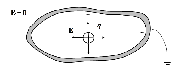 Пусть теперь поле создано зарядом, расположенным в области, ограниченной замкнутой проводящей оболочкой. В случае рис. 2.8 оболочка заземлена проводником, а в случае рис. 2.9 – нет. Поле заряда
