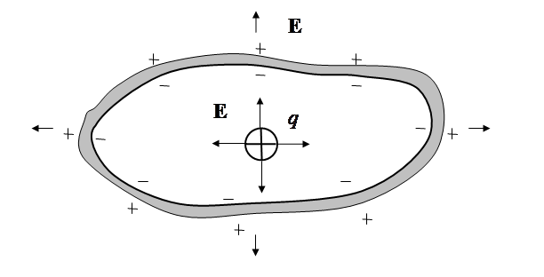 , то отрицательные заряды накапливаются на внутренней поверхности оболочки, а положительные – на внешней. Поле зарядов внутренней поверхности оболочки экранирует поле заряда