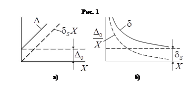 В зависимости от вида функции преобразования прибора (преобразователя) его общая погрешность и ее составляющие различным образом зависят от значения измеряемой величины. Рассмотрим эти зависимости при разных функциях преобразования