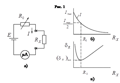 Нетрудно выяснить, что преобразование такого вида выполняется в простейшем омметре со стрелочным указателем — микроамперметром (рис 3а). Измеряемой величиной является