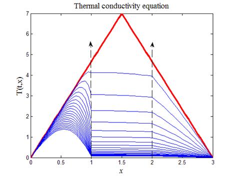 На рис.9 приведен итог работы кода программы листинга_№4. Красной жирной линией нарисован начальный треугольный профиль температуры. Вертикальные стрелки на графике отделяют области с разными коэффициентами теплопроводности. Согласно коду листинга_№4, коэффициенты теплопроводности отличаются друг от друга на три порядка.