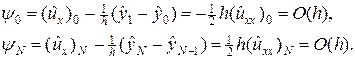 Таким образом, согласно (46), невязка граничных условий имеет первый порядок точности по h, тогда как в регулярных точках порядок точности второй по h, т.е. при выборе аппроксимации граничных условий по формулам (45) происходит потеря точности.