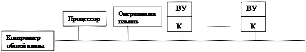 Все устройства компьютера (см рис. 3.) процессор П, оперативная память ОП и внешние устройства ВУ подключаются к обшей шине, через контроллеры К.