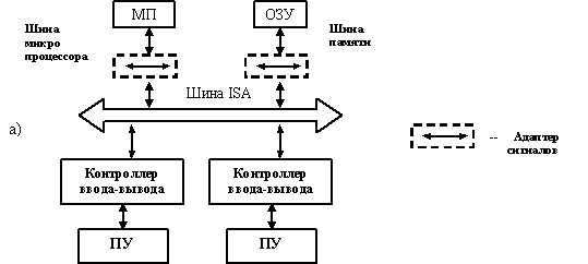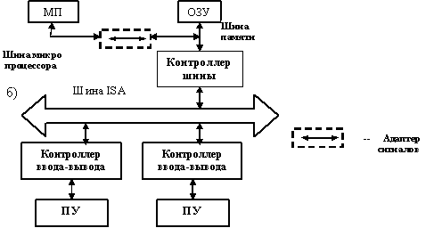 В начале эры персональных компьютеров частота работы процессора составляла 10 МГц, при этом на выполнение даже самых простейших операций процессор затрачивал несколько тактов. В таких условиях для обеспечения бесперебойной работы процессора было достаточно всего 4 миллионов обращений к памяти в секунду, что соответствовало циклу работы в 250 нс. Этим условиям удовлетворяла одношинная структура систем ввода-вывода, когда все устройства компьютера, включая ОЗУ, общались с процессором через общую шину (рис.1a), которую называли системной. Все интерфейсы ПУ подключались к этой шине. Наиболее распространенной системной шиной в этот период стала сначала 8-разрядная, затем 16-разрядная шина ISA (Industry Standard Architecture), работающая на частоте 8 МГц.
