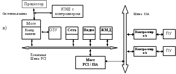 С ростом частоты работы ПК и изменения времени доступа к ОЗУ пропускная способность шины ISA стала тормозить работу процессора. Решение проблемы нашли в выделении канала передачи данных МП-ОЗУ в отдельную шину, построенную на базе внешнего интерфейса МП, и изолированную от медленной шины ISA посредством контроллера шины данных. Это повысило производительность работы центрального процессора. Все ПУ продолжали взаимодействовать с центральным процессором через системную шину (см. рис. 1б).
