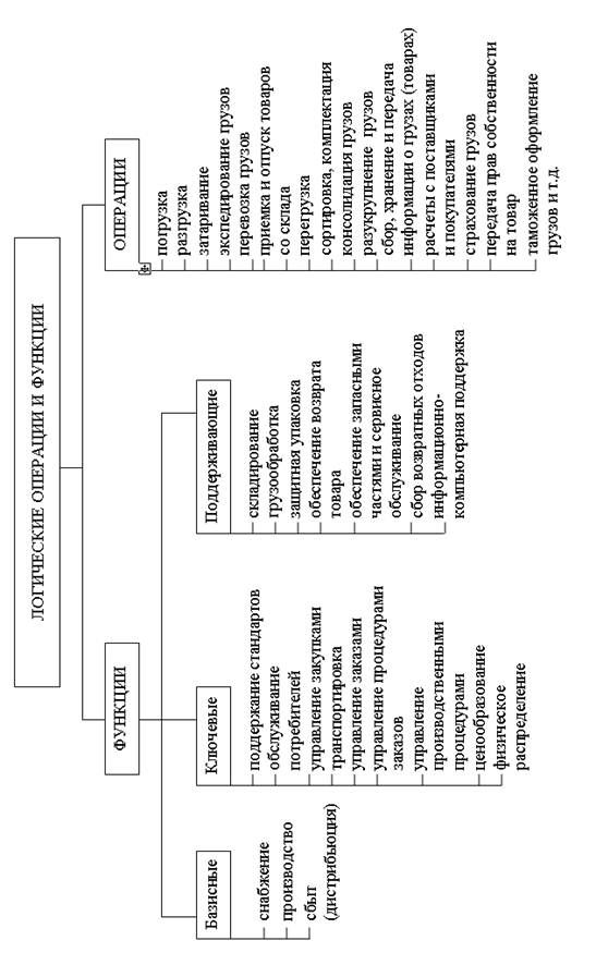 Среди логистических функций на уровне организации бизнеса можно выделить (1) базисные, (2) ключевые и (3) поддерживающие (вспомогательные). На рис.1.2 представлена схема-классификация логистических операций и функций.