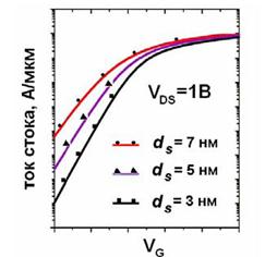 Уменьшение толщины кремниевого тела КНИ МОПТ (конечно, речь здесь идет только о полностью обедненных приборах) приводит к уменьшению подпорогового размаха (S -фактора) и соответственно, к уменьшению подпороговых токов утечки вследствие уменьшения емкости обедненного слоя (рис. 6.5).