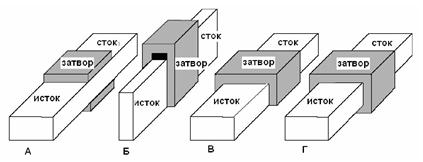 Рис. 6.10. Структуры КНИ многозатворных (multiple gate) транзисторов: (А) планарный транзистор с двойным затвором (double-gate −DG); (Б) FinFET; (В) тройной (П-затвор); (Г) круговой затвор