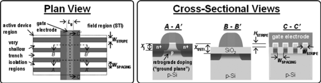 На практике такая рифленая структура затвора может быть достигнута путем создания канавок в изоляции в промежутках между полосками до формирования затвора, как это делается при создании FinFET. Для подавления подпороговых утечек и ослабления вариации порогового напряжения вследствие RDF должно использоваться суперступенчатое ретроградное легирование, локализованное в базе под полосками затвора. Так как затвор окружает канал, величина заряда ОПЗ под затвором на единицу ширины канала меньше, чем в планарном приборе, так что вариации порогового напряжения вследствие RDF уменьшаются.