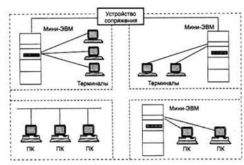 Но шло время, потребности пользователей вычислительной техники росли, им стало недостаточно собственных компьютеров, им уже хотелось получить возможность обмена данными с другими близко расположенными компьютерами. В ответ на эту потребность предприятия и организации стали соединять свои мини-компьютеры вместе и разрабатывать программное обеспечение, необходимое для их взаимодействия. В результате появились первые локальные вычислительные сети (рис. 2). Они еще во многом отличались от современных локальных сетей, в первую очередь - своими устройствами сопряжения. На первых порах для соединения компьютеров друг с другом использовались самые разнообразные нестандартные устройства со своим способом представления данных на линиях связи, своими типами кабелей и т. п. Эти устройства могли соединять только те типы компьютеров, для которых были разработаны, - например, мини-компьютеры PDP-11 с мэйнфреймом IBM 360 или компьютеры «Наири» с компьютерами «Днепр». Такая ситуация создала большой простор для творчества студентов - названия многих курсовых и дипломных проектов начинались тогда со слов «Устройство сопряжения...».