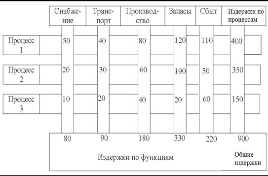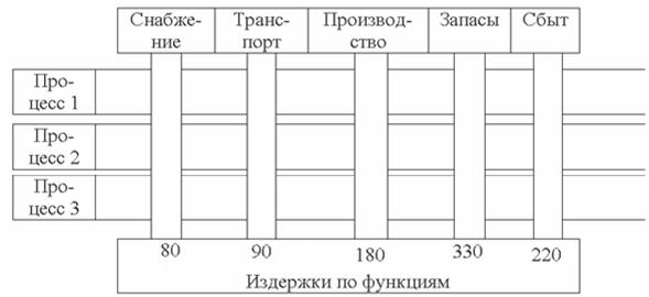Главная проблема, возникающая при использовании общих издержек, заключается в том, что традиционная бухгалтерская практика классификации и учета основных видов издержек, как правило, не обеспечивает возможности классификации всей цепочки затрат, связанных с тем или иным процессом продвижения МП от источника к потребителю. Традиционные методы учета, как показано на рис.1.6, направлены на определение затрат по функциональным областям (по вертикали) и объединяют издержки в крупные агрегаты. Это не позволяет выделять затраты, возникающие в ходе осуществления сквозного процесса продвижения материального потока (бизнес-процесса), а значит, не позволяет провести детальный анализ различных по происхождению затрат, учесть все последствия принятых управленческих решений, а также их воздействие на корпоративную прибыль.