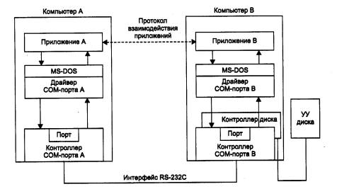 Драйвер СОМ-порта вместе с контроллером СОМ-порта работают примерно так же, как и в описанном выше случае взаимодействия ПУ с компьютером. Однако при этом роль устройства управления ПУ выполняет контроллер и драйвер СОМ-порта другого компьютера. Вместе они обеспечивают передачу по кабелю между компьютерами одного байта информации. (В «настоящих» локальных сетях подобные функции передачи данных в линию связи выполняются сетевыми адаптерами и их драйверами.)