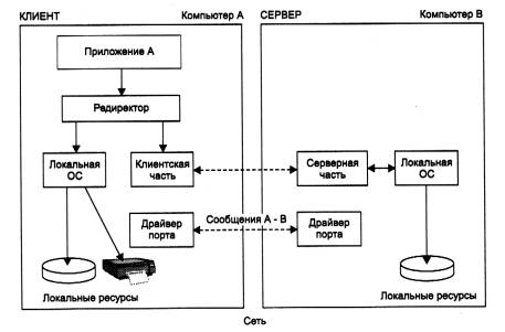 Программные клиент и сервер выполняют системные функции по обслуживанию запросов приложений компьютера А на удаленный доступ к файлам компьютера В. Чтобы приложения компьютера В могли пользоваться файлами компьютера А, описанную схему нужно симметрично дополнить клиентом для компьютера В и сервером для компьютера А.
