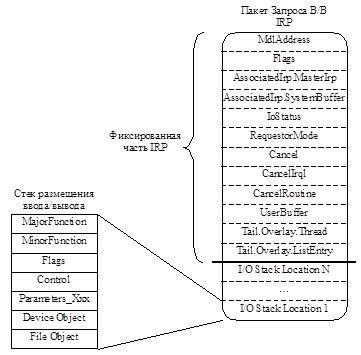 Для обеспечения этого каждый Пакет Запроса Ввода - вывода состоит из двух частей: "фиксированной" части и Стека Ввода - вывода. Фиксированная часть IRP содержит информацию относительно той части запроса, которая или не изменяется от драйвера к драйверу, или которую не надо сохранять при передаче IRP от одного драйвера к другому. Стек Ввода - вывода содержит набор Стеков Размещения Ввода - вывода, каждый из которых содержит информацию, специфическую для каждого драйвера, который может обрабатывать запрос.