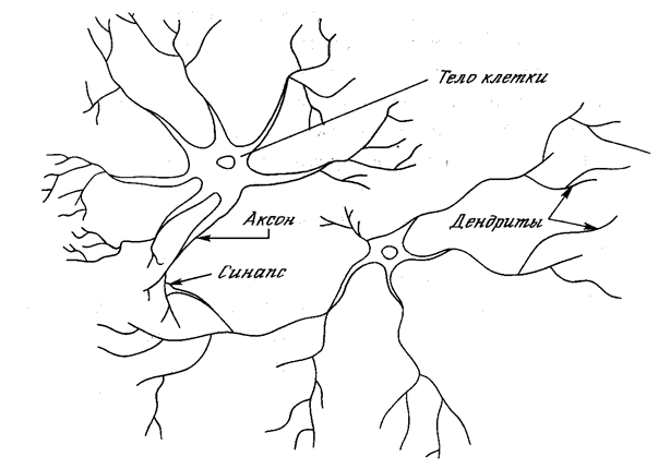 На рис. 1 показана структура пары типичных биологических нейронов. Дендриты идут от тела нервной клетки к другим нейронам, где они принимают сигналы в точках соединения, называемых синапсами. Принятые синапсом входные сигналы подводятся к телу нейрона. Здесь они суммируются, причем одни входы стремятся возбудить нейрон, другие – воспрепятствовать его возбуждению. Когда суммарное возбуждение в теле нейрона превышает некоторый порог, нейрон возбуждается, посылая по аксону сигнал другим нейронам. У этой основной функциональной схемы много усложнений и исключений, тем не менее большинство искусственных нейронных сетей моделируют лишь эти простые свойства.