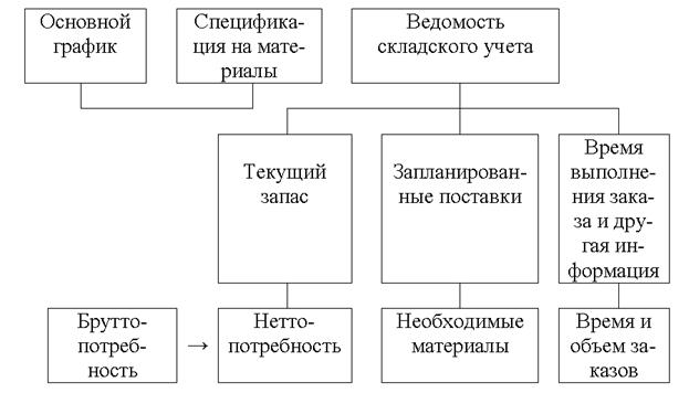Методика планирования материальных потребностей (Material Requirements Planning - MRP). Ее применяют при зависимом спросе, т.е. спросе, который зависит от спроса на специфическую ГП. Исходными данными для расчета являются: