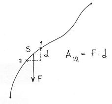 Если тело движется по кривой, причем сила направлена под углом к перемещению, то работа на участке 12 находится по приведенной формуле. Говоря математическим языком, d -это проекция перемещения s на направление действия силы F. Полная работа, очевидно, будет равна сумме работ на отдельных участках пути, которые можно считать прямолинейными.