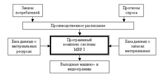 Программный комплекс MRP I основан на систематизированных производственных расписаниях (графиках выпуска конечной продукции) в зависимости от потребительского спроса и комплексной информации, получаемой из баз данных о материальных ресурсах и их запасах.