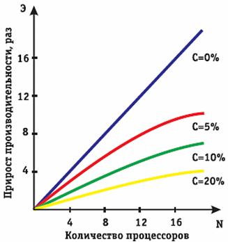 Рис. Зависимость прироста производительности от количества процессоров. С - доля последовательных операций